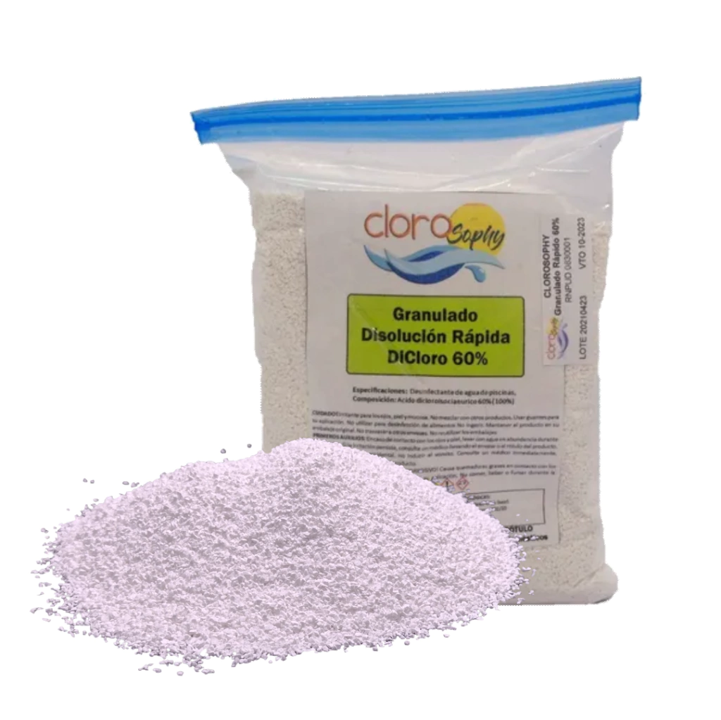 Granulado Disolución rápida a razón de 20g cada 10.000 litros de agua.